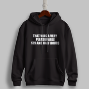 Celebrate the long and enjoyable moments with the "139 and Half Hours" Black Hoodie. Featuring the striking quote "That was a very pleasurable 139 and half hours", this hoodie is perfect for fans of quirky movie humor and bold style statements.