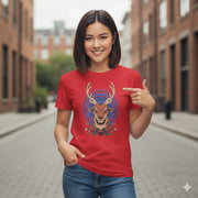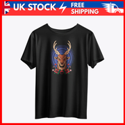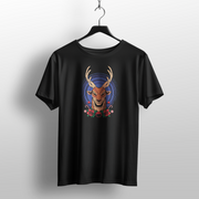 Give your holiday look an edgy twist with this Aggressive Deer Stag Christmas T-Shirt. This black tee features a detailed, stylized graphic of a fierce Reindeer or Stag with large antlers and an intense expression. The design is framed by a blue circle and accented with festive but dark motifs, including Christmas ornaments, roses, and candy canes. This unique shirt is perfect for rock and metal fans, or anyone who wants a comfortable, non-traditional design that mixes holiday elements with a bold, artistic style.