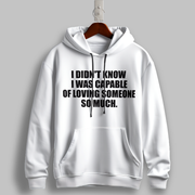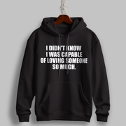 Express deep emotion with the "Capable of Loving" Black Hoodie. Featuring the impactful phrase, "I didn’t know I was capable of loving someone so much," in bold white text, this hoodie combines minimalistic design with powerful sentiment. Perfect for those who wear their heart on their sleeve—literally.