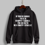 Make a bold statement with the "Crappy Teacher" Black Hoodie. Featuring the witty and rebellious phrase, "If you’re going to be a crappy teacher, I’m going to be a crappy student," this hoodie is perfect for those who love humor with a touch of sarcasm. Ideal for movie quote enthusiasts and those who live life unapologetically.