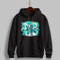 This black hoodie features a vibrant, spray-painted design of the Pisces zodiac symbol. The turquoise and teal colors pop against the black fabric, creating a bold and stylish look. The design includes a playful fish, hearts, and stars, adding a touch of whimsy and personality.